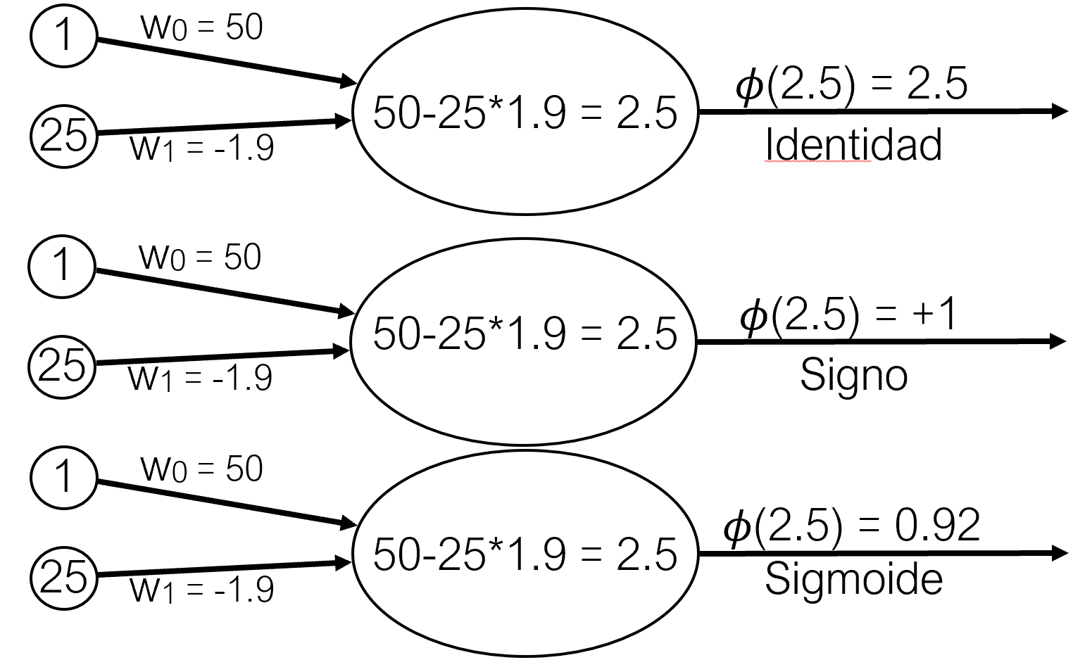 Para la capa de entrada, donde únicamente se quiere incorporar el valor de los predictores, la función de activación es la unidad, es decir, sale lo mismo que entra.