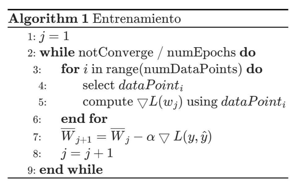 El algoritmo toma los ejemplos del conjunto de entrenamiento en orden aleatorio y ajusta los pesos hasta que se alcanza algún criterio de convergencia.