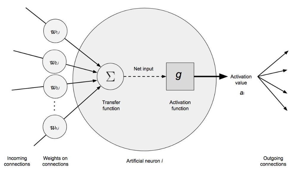 A este valor se le aplica una función de activación \(g\) que lo transforma en lo que se conoce como el valor de activación \(a\), que es lo que finalmente sale de la neurona.