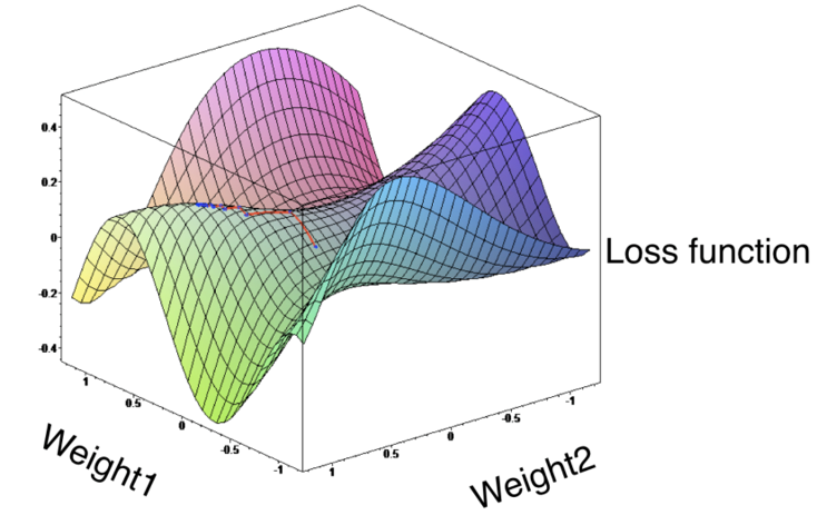 donde \(\alpha\) es el parámetro de aprendizaje (tasa de aprendizaje) y \(\bigtriangledown L\) es el gradiente descendiente de la función de pérdida. La idea es acercarse hacia el mínimo local, en contra del gradiente.