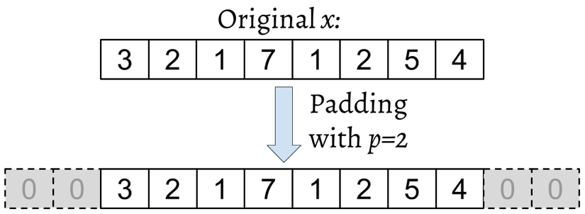 Este proceso se llama relleno de ceros o simplemente relleno (padding). Aquí, el número de ceros añadidos a cada lado se denota por \(p\). Un ejemplo de relleno para un vector unidimensional, \(x\), se muestra a continuación: