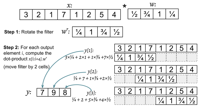 \[ y = x * w \rightarrow y[i] = \sum_{k=0}^{m-1} x^p[i + m - k] \cdot w[k] \]