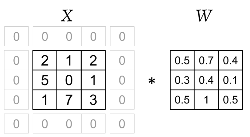 En este contexto, el primer argumento (\(x\)) se le llama input y el segundo argumento (\(w\)) se le llama kernel, y a la salida se le llama feature map