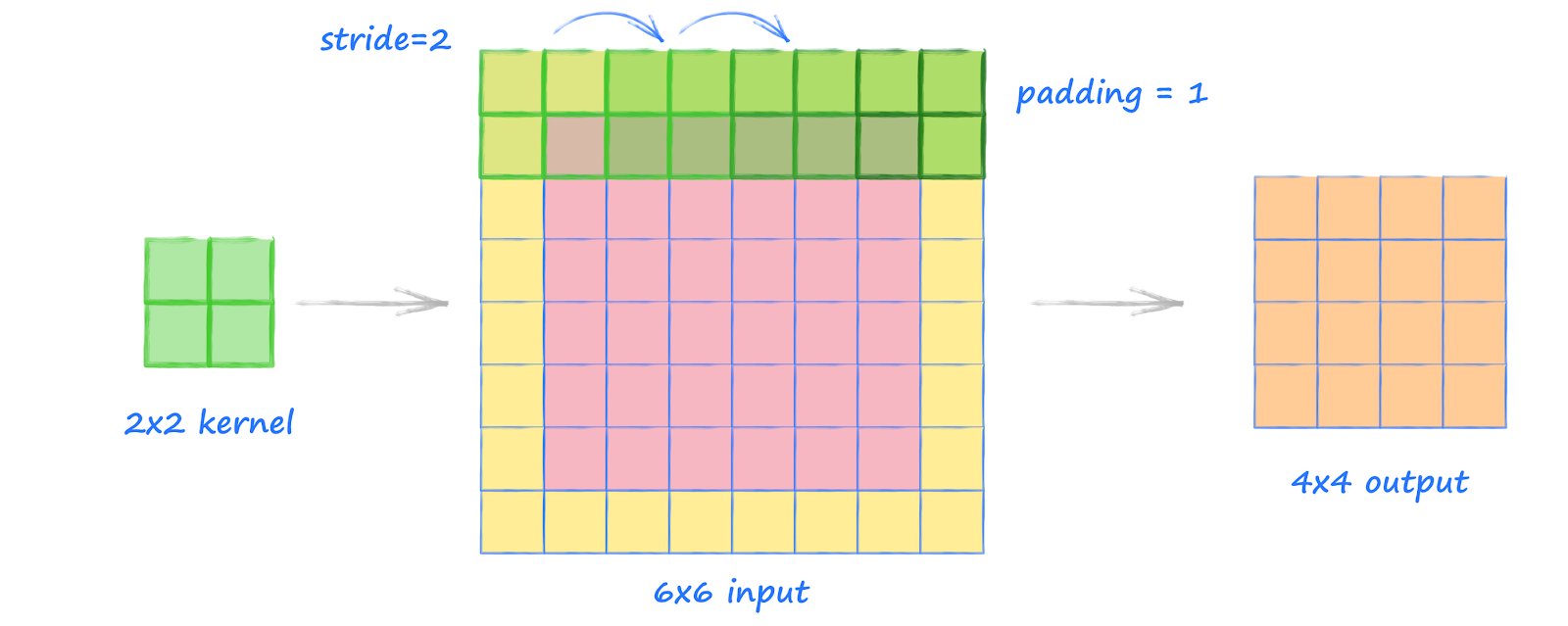 El filtro rotado, \(w^r\), se desplaza dos celdas cada vez que se desliza. Este desplazamiento es otro hiperparámetro de una convolución, el paso o stride, \(s\). En este ejemplo, el stride es dos, \(s = 2\).
