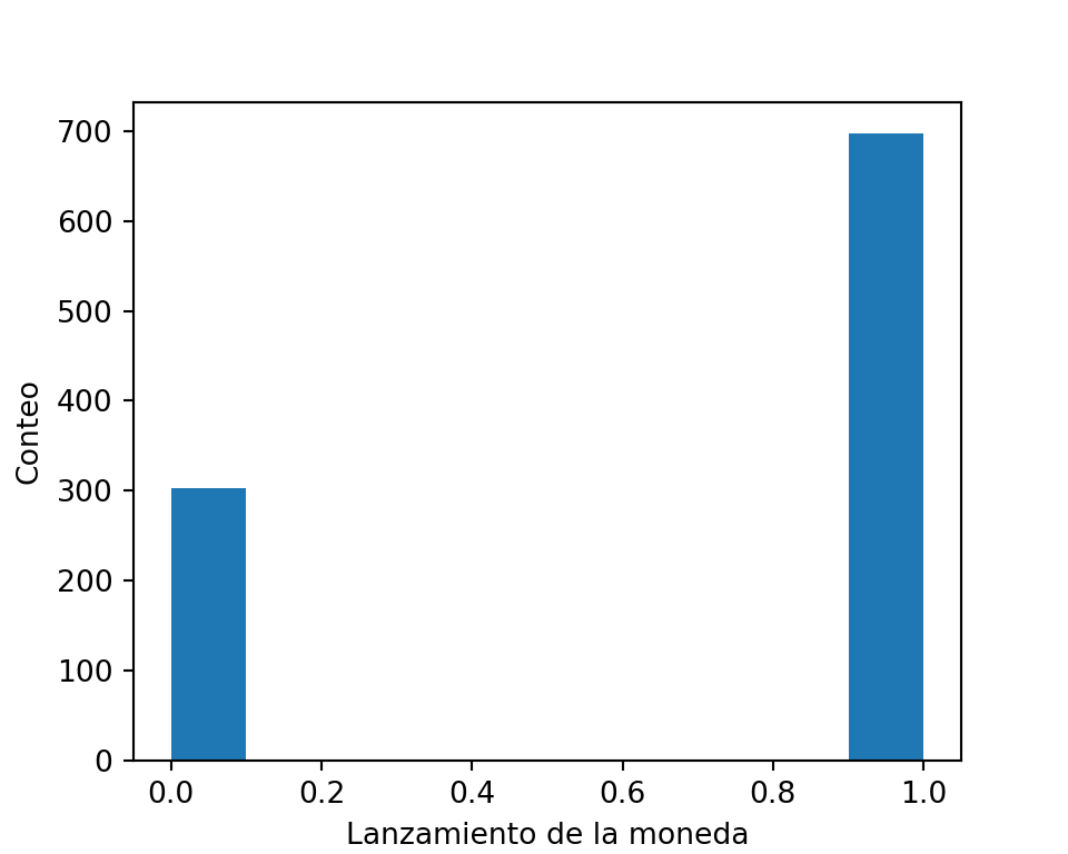 # importando libreríasimport matplotlib.pyplot as pltfrom scipy.stats import bernoulli#Datosp=0.7#Probabilidad de ocurrencia n =1000#Tamaño de la muestramuestras = bernoulli.rvs(p,size=n) plt.figure(figsize=(5,4))plt.hist(muestras);plt.xlabel('Lanzamiento de la moneda')plt.ylabel('Conteo');plt.show()
