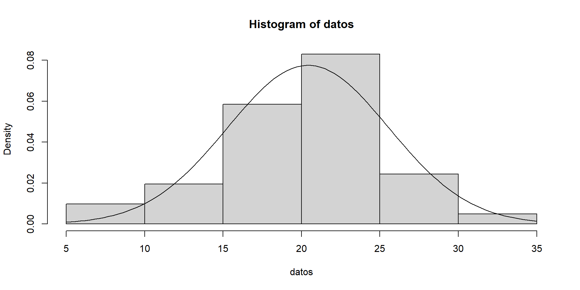 datos <-c(22.56,22.33,24.58,23.14,19.03,26.76,18.33,23.10,21.53,9.06,16.75,23.29,22.14,16.28,18.89,27.48,10.44,26.86,27.27,18.74,19.88,15.76,30.77,21.16,24.26,22.90,27.14,18.02,21.53,24.99,19.81,11.88,24.01,22.11,21.91,14.35,11.14,9.93,20.22,17.73,19.05)ks.test(datos, pnorm, mean =20, sd =5) # Una muestra
