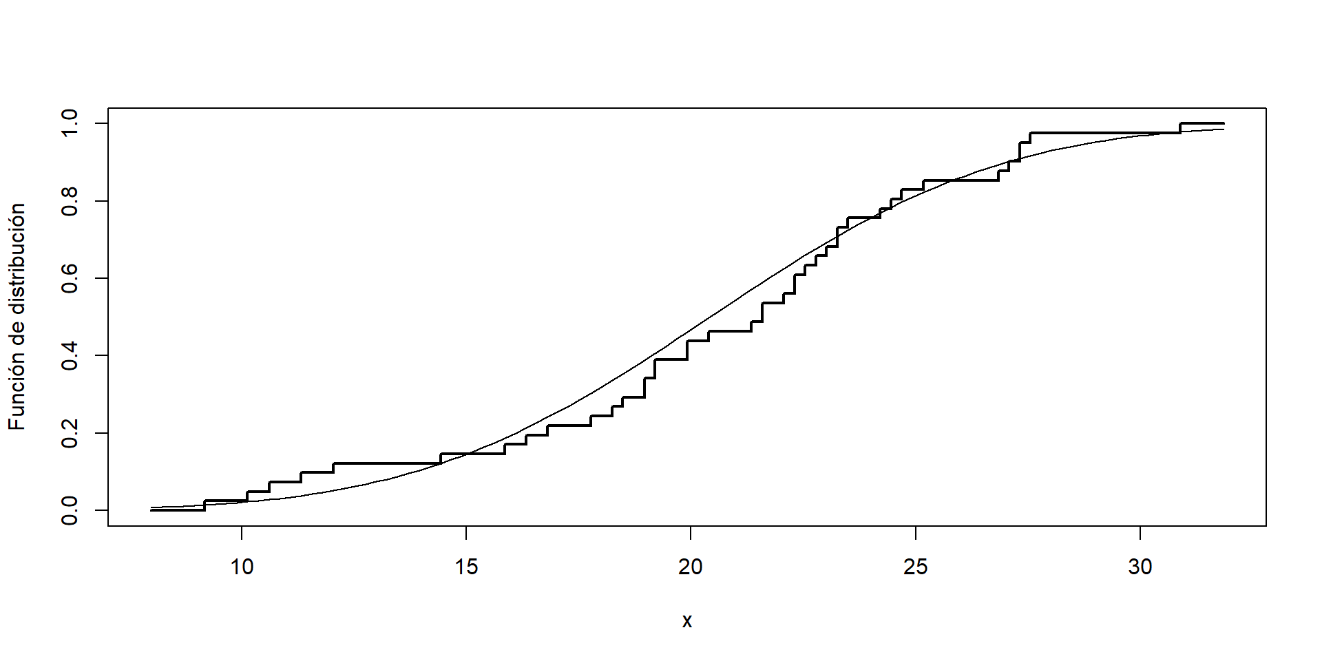 \(S(x)\) es de ayuda en la estimación de \(F(x)\), la distribución desconocida de los \(X_i\)s. Entonces, podemos comparar la FDE \(S(x)\) con una función de distribución hipotética \(F(x)'\), y evaluar su ajuste.