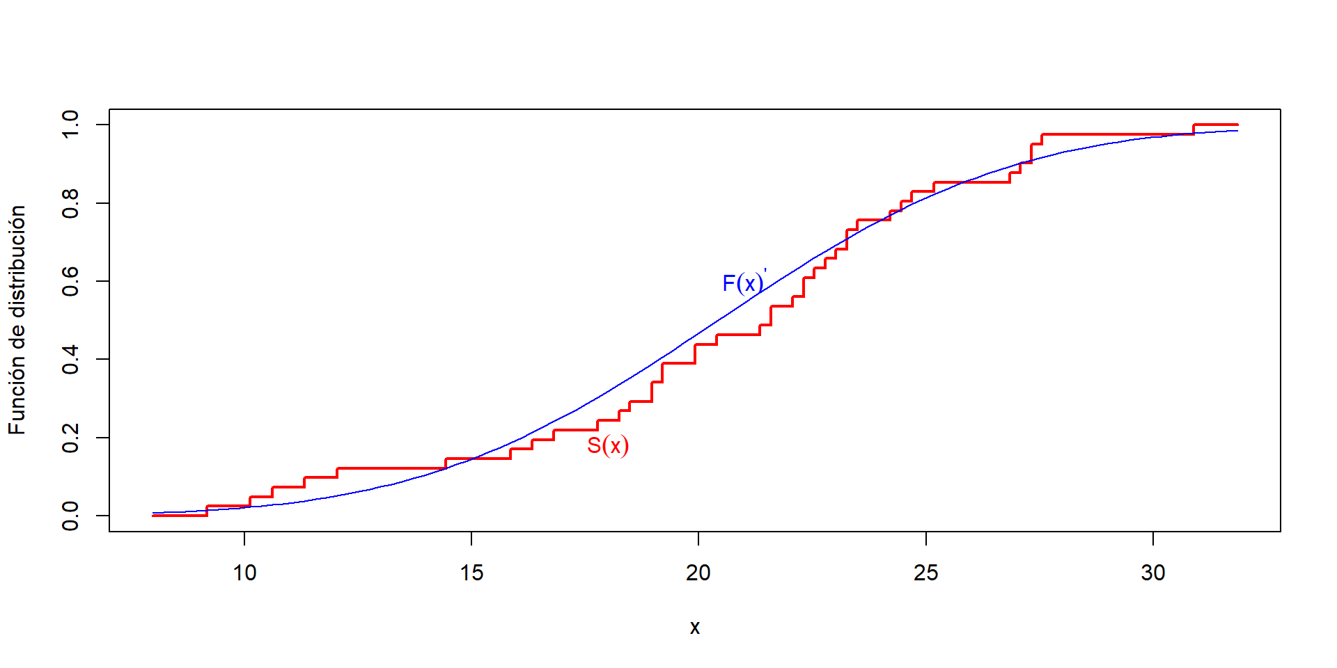 Ejemplo de la FDE \(S(x)\) vs una función de distribución conocida \(F(x)'\) para una muestra.