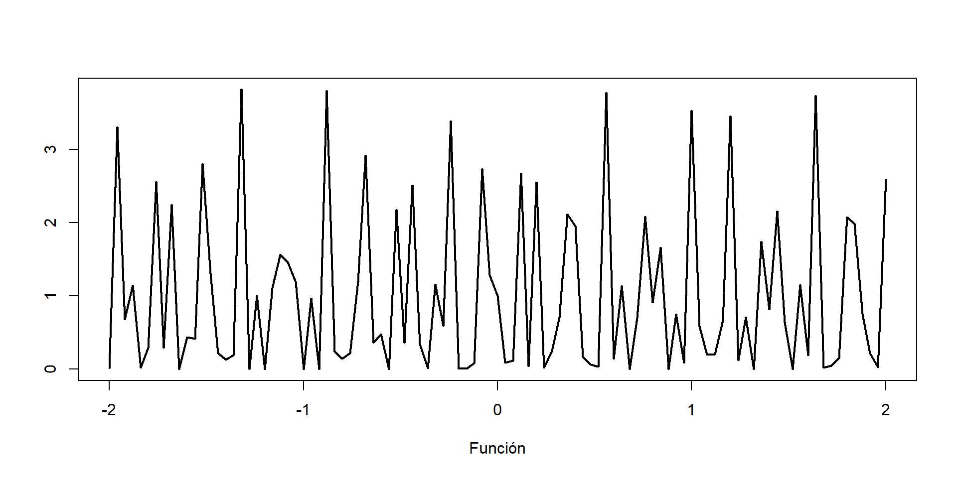 g =function(x){ (cos(50*x)+sin(20*x))^2}curve(g,from=-2,to =2,xlab="Función",ylab="",lwd=2)