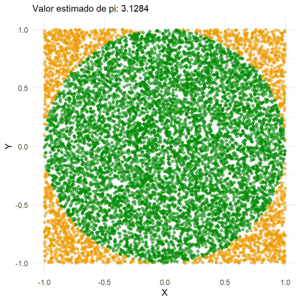 Al simular números aleatorios dentro de este cuadrado, obtenemos valores aproximados para el área del círculo y el área del cuadrado. Por lo tanto, podemos estimar \(\pi\) tomando la proporción de puntos simulados que caen dentro del círculo y el número total de puntos simulados, y multiplicar por 4.