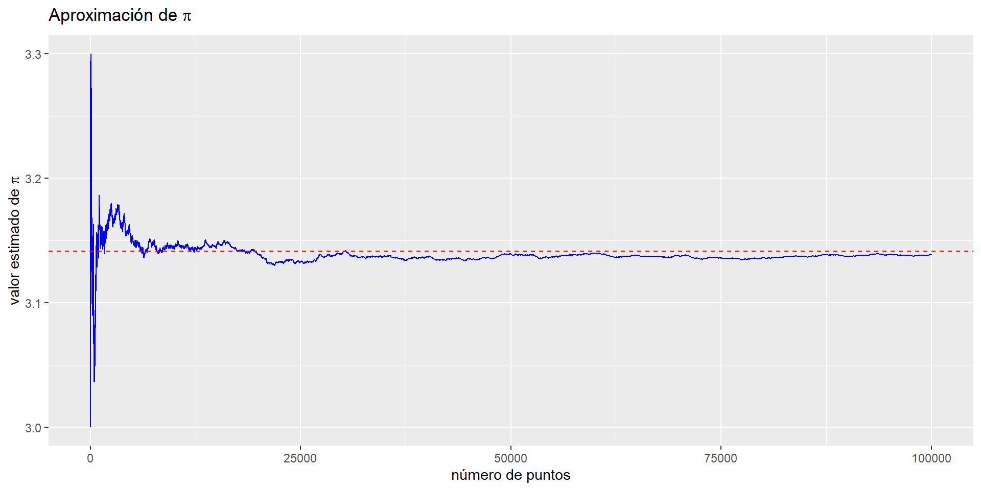 \[\frac{\mbox{área del círculo}}{\mbox{área del cuadrado}} = \frac{\pi \cdot r^2}{4\cdot r^2} = \frac{\pi}{4}\] A partir de lo cual, podemos estimar \(\pi\) usando la siguiente fórmula