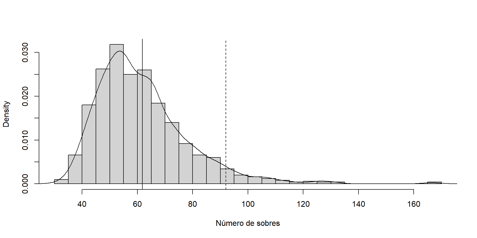 sol =mean(nsobres)nmin =quantile(nsobres, probs =0.95)hist(nsobres, breaks ="FD", freq =FALSE,main ="", xlab ="Número de sobres")lines(density(nsobres))abline(v = sol)abline(v = nmin, lty =2)