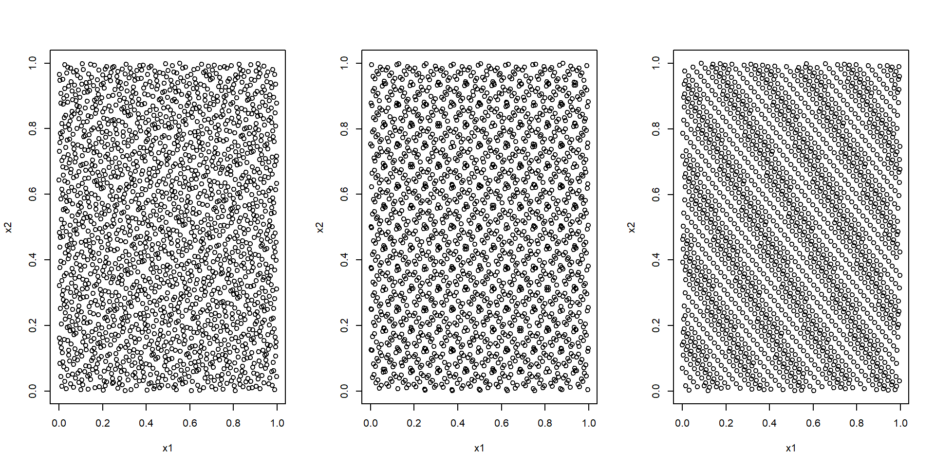library(randtoolbox)n <-2000par.old <-par(mfrow =c(1, 3))plot(halton(n, dim =2), xlab ='x1', ylab ='x2')plot(sobol(n, dim =2), xlab ='x1', ylab ='x2')plot(torus(n, dim =2), xlab ='x1', ylab ='x2')